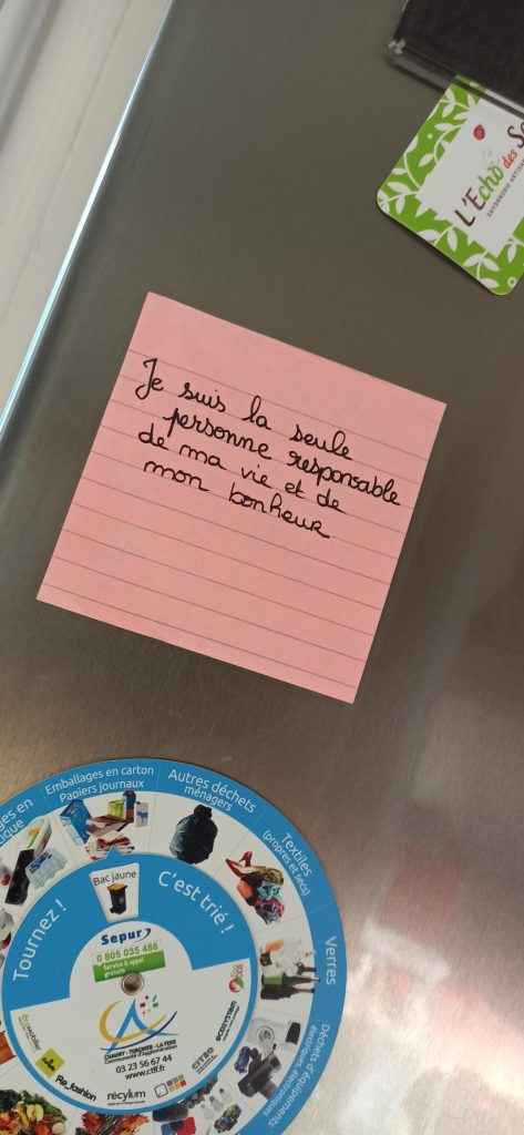 J’ai alors réalisé que j’avais la chance d’avoir un corps en bonne santé, des membres qui fonctionnent et un entourage qui m’aime et que j’aime. Alors, petit à petit, après avoir collé sur mon frigidaire un post-it avec écrit « je suis la seule responsable de ma vie et de mon bonheur », j’ai mis en place des choses.