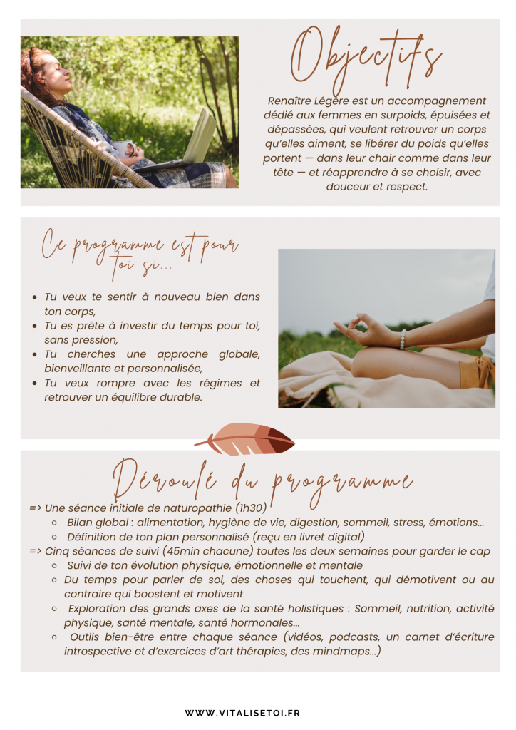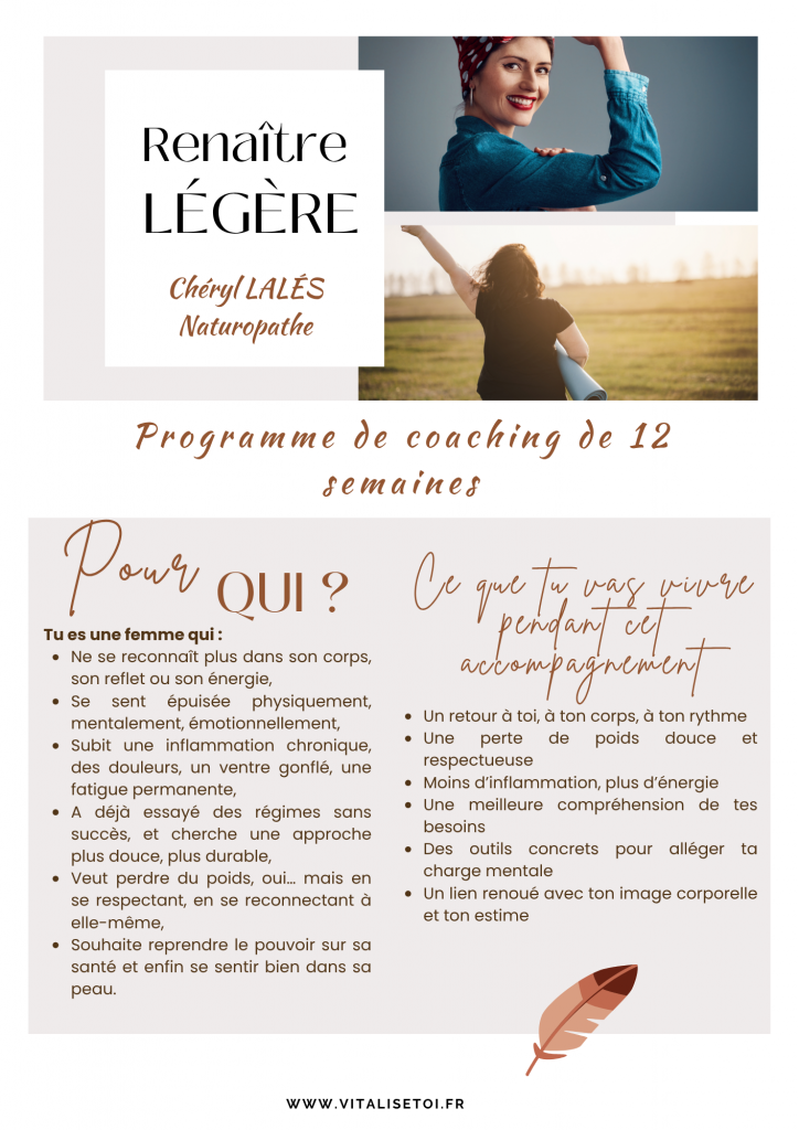 Renaître légère est mon offre signature ! C’est un programme que j’ai pensé, imaginé pour les femmes épuisées, fatiguée, vivant la charge mentale comme un poids sans nom et souhaitant perdre du poids en pensant de nouveau à elle.
