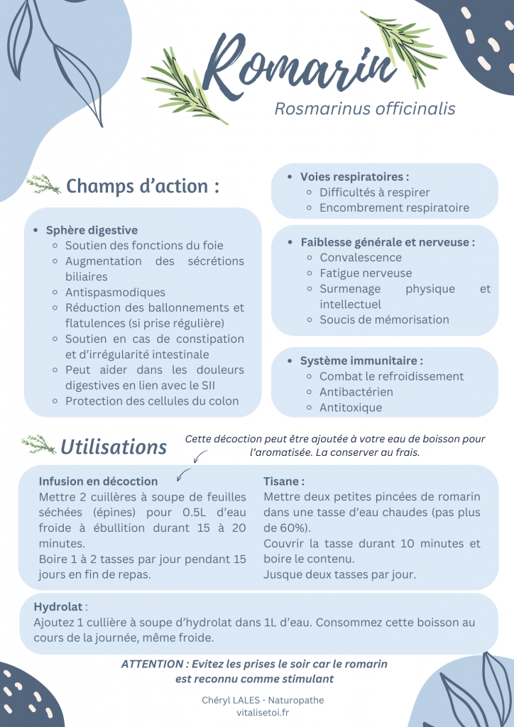 Le romarin est l’une de mes plantes aromatiques et médicinales préférées ! Son goût est très fort de part sa présence aromatique (1 à 2%), et aromatise parfaitement les plats, mais aussi les infusions.