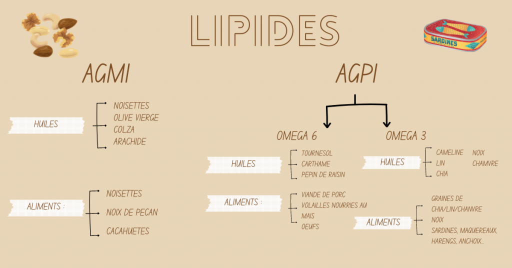 - Acides gras polyinsaturés (AGPI) : Oméga 3 et 6